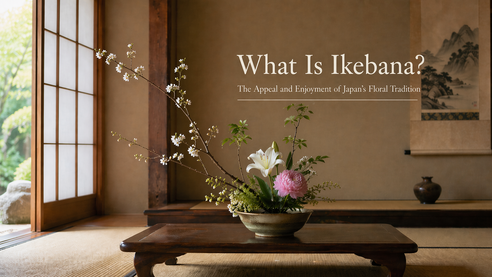 The appeal of ikebana becomes clearer when it is seen not only as an isolated arrangement, but as something connected to the space around it. In Japanese rooms, cultural facilities, temples, or spaces close to the atmosphere of a tea room, the relationships among flowers, vessel, empty space, and background are often easier to grasp naturally.