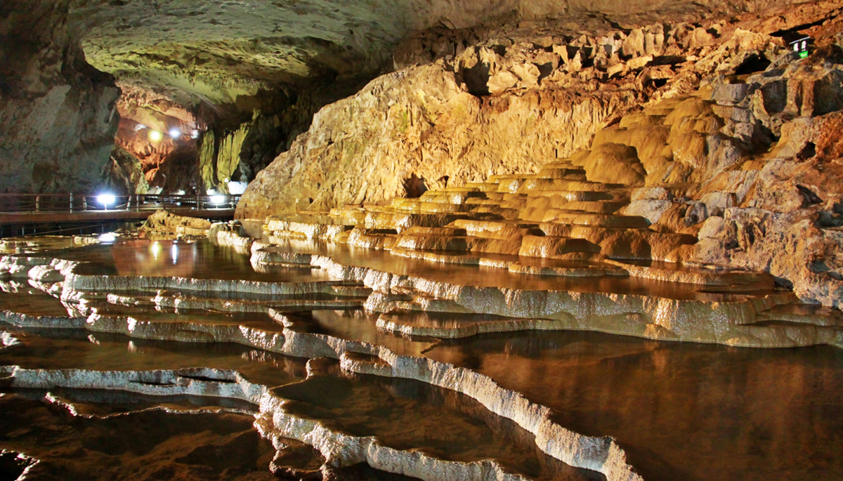 It features a large underground space filled with stalactites and stalagmites.