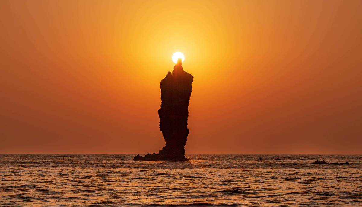 At sunset, the sun aligns perfectly with the tip of the island, making it appear like a candle flame.