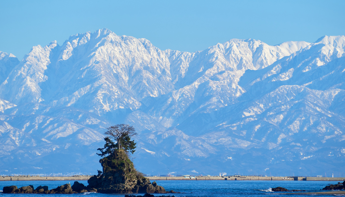 This coastline offers a famous view of the Tateyama Mountains rising beyond the sea.